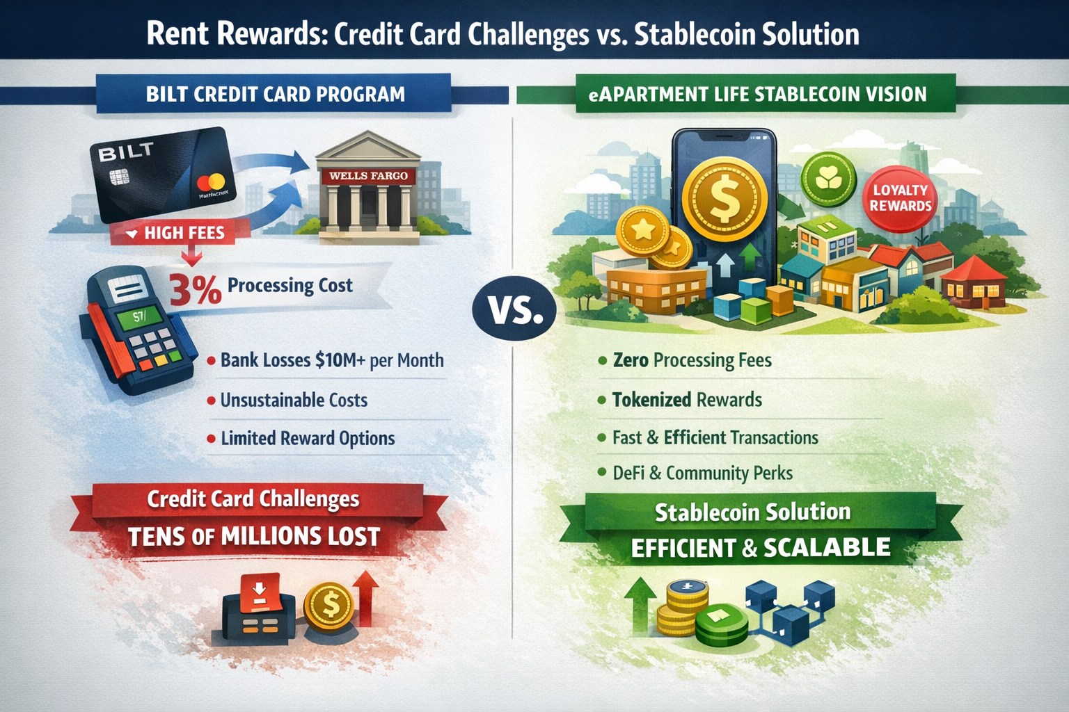 As a result, Bilt continues to iterate its product (new card lineups, expanded partners, mortgage rewards, and broader payment options), but the underlying reliance on credit-card rails still exposes it to the inherent costs and limitations of that system. eApartment Life’s Stablecoin-Based Rent + Loyalty Vision (Future-Looking) The concept with eApartment Life reimagines rent payments and loyalty rewards by eliminating the traditional credit-card processing layer entirely — including the ~3% fee — by enabling tenants to pay rent directly with a stablecoin built into the community’s commerce platform. Under this model: